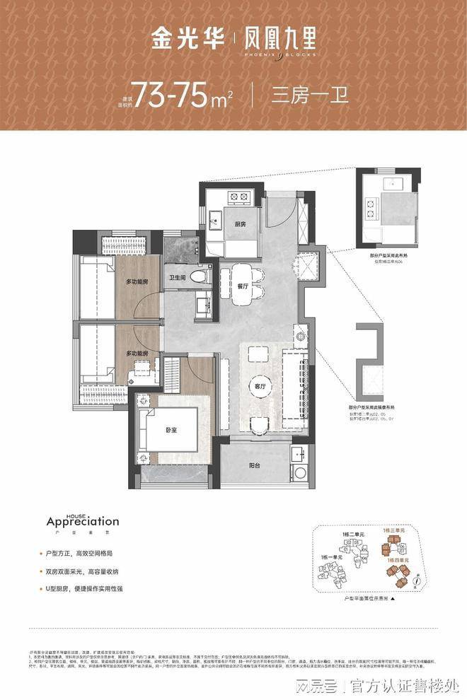 建面约73-75㎡3房2厅1卫,是项目很受欢迎的户型。这款户型最大的亮点就是做出了市面上85平三房的既视感,实用率高,实属难得。