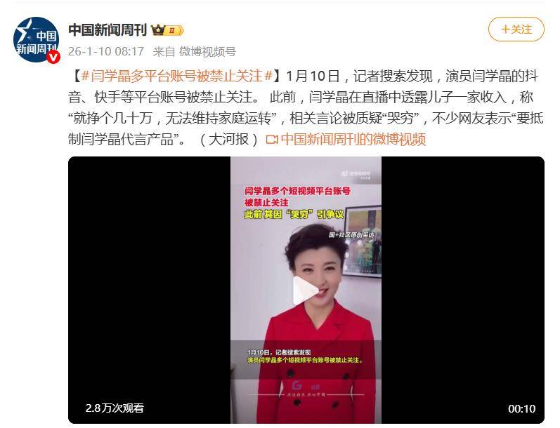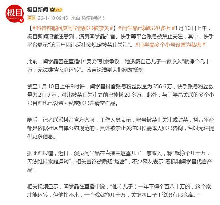 凤凰体育,凤凰体育直播,凤凰体育APP一句“年入几十万不够花”,直接把演员闫学晶送上了风口浪尖,还让她的短视频账号被平台“禁关”了。1月10日,据媒体报道,闫学晶的抖音和快手账号均被禁止关注,这场因直播言论引发的争议,正从网络口水战演变为实打实的商业与形象危机。