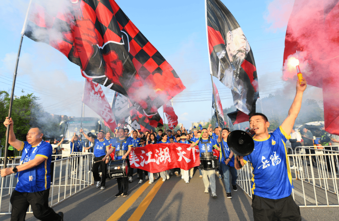 来自湖南岳阳的300名球迷专程赶来,与咸宁啦啦队现场“斗歌斗舞”。岳州军球迷协会志愿部的卢先生竖起大拇指:“下次咸宁朋友去岳阳,我们一定好好招待!”